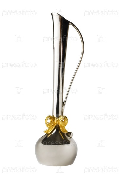 Небольшой стальной сосуд с позолоченным бантиком, изолированный на белом фоне