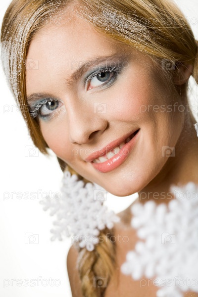 Красивая блондинка, украшенная снежинками, смотрит в камеру и улыбается