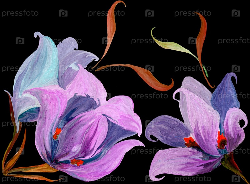 Набор цветков и листьев полевой сон-травы. Имитация живописи