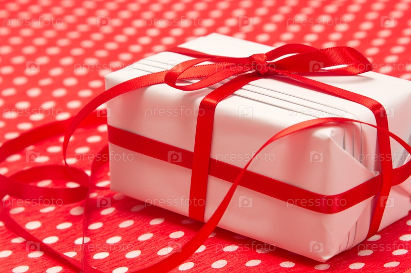 Белая подарочная коробка с красным бантиком и бумажные цветы