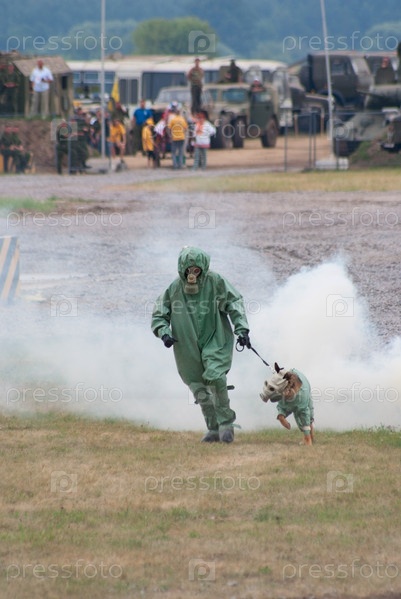 Военный кинолог с собакой в костюмах химзащиты проходят через задымление