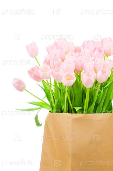 Розовые тюльпаны в пакете на белом фоне