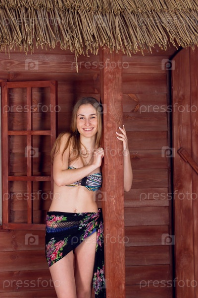 Девушка позирует в купальнике возле дома
