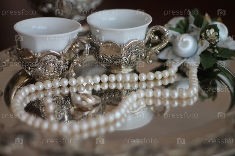 Фарфоровые чашки в серебрянных подставках и украшения из жемчуга на подносе