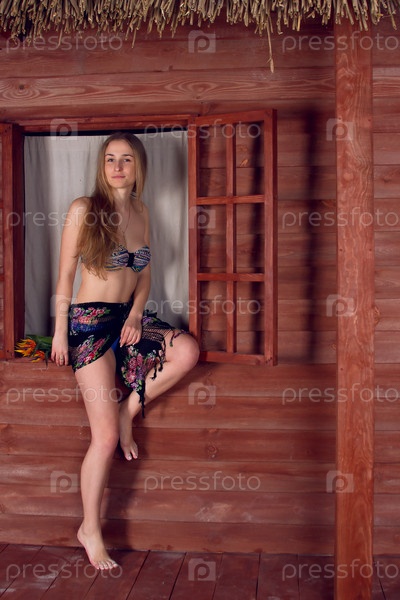 Девушка позирует в купальнике возле дома