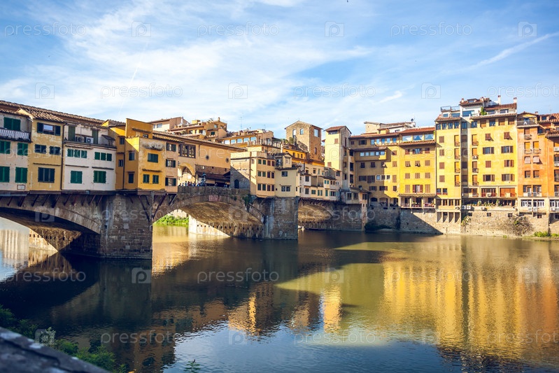 Вид на средневековый каменный мост Ponte Vecchio и реку Арно во Флоренции, Тоскана, Италия