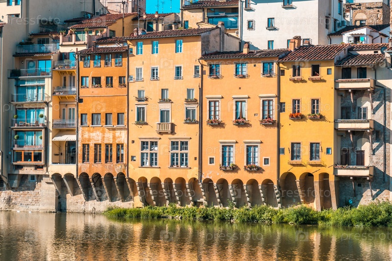 Красочные старые здания выстроены вдоль реки Арно во Флоренции, Италия