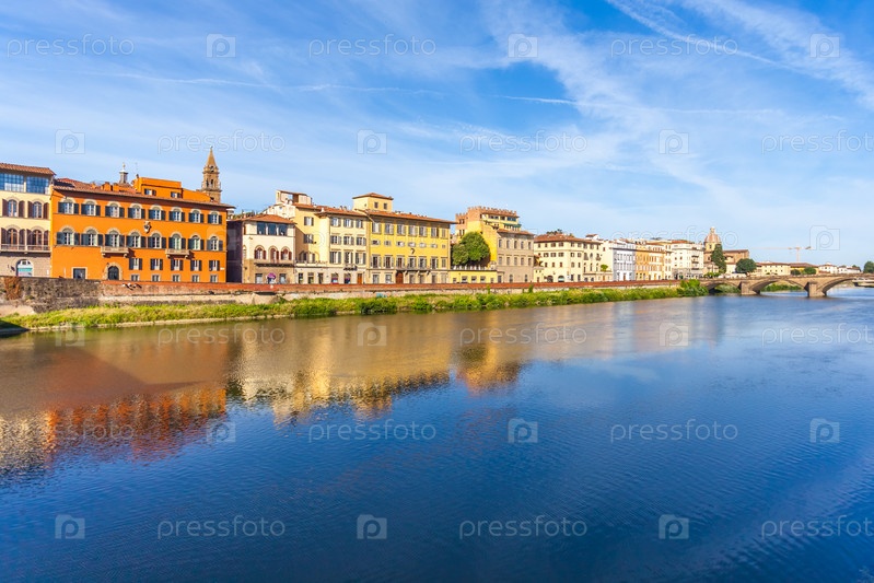 Красочные старые здания выстроены вдоль реки Арно во Флоренции, Италия