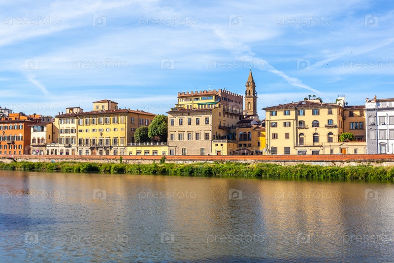 Красочные старые здания выстроены вдоль реки Арно во Флоренции, Италия