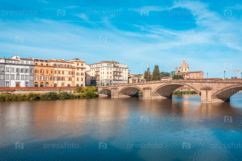 Красочные старые здания выстроены вдоль реки Арно во Флоренции, Италия