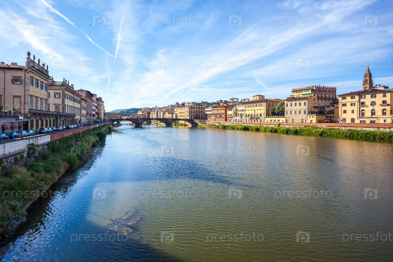 Красочные старые здания выстроены вдоль реки Арно во Флоренции, Италия