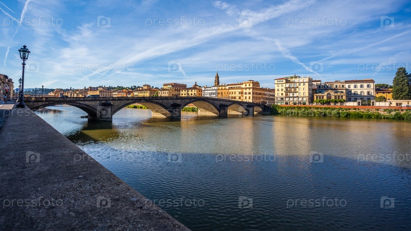 Красочные старые здания выстроены вдоль реки Арно во Флоренции, Италия