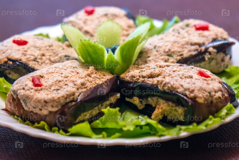 Жареные баклажаны и перец, набитые орехами на тарелке
