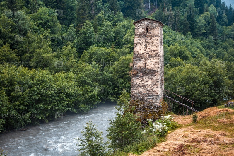 Средневековая Свановская башня любви на реке Энгури, деревня Кала, Самегрело-Земо Сванетия, Грузия