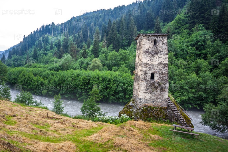 Средневековая Свановская башня любви на реке Энгури, деревня Кала, Самегрело-Земо Сванетия, Грузия