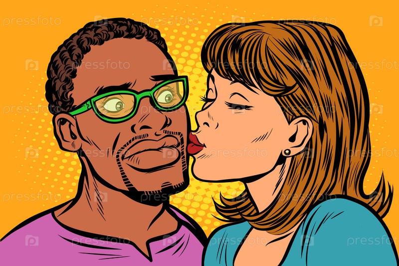 Женщина целует мужчину. мультиэтническая пара. смущение