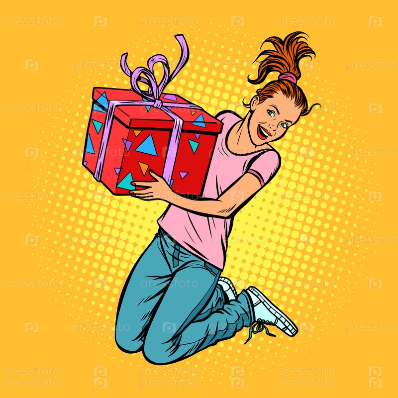 Подростковая девушка с подарком прыгает от радости