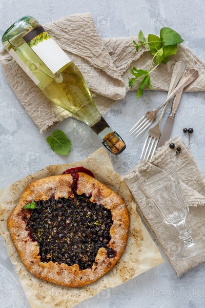 Березовый пирог (галет), бутылка белого вина и стакан