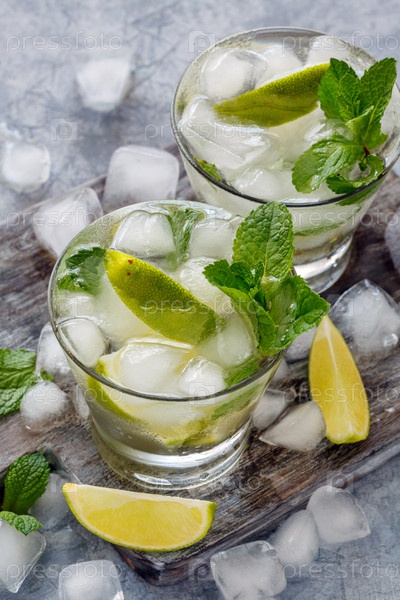 Лимонад с мятой, нарезами лайма и кубиками льда