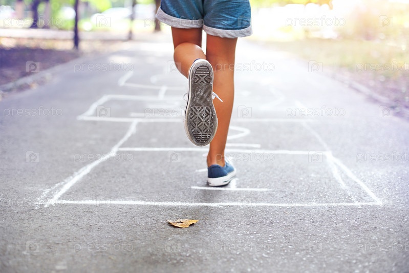 Ребенок играет в хопскотч на детской площадке на свежем воздухе