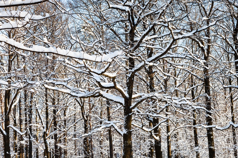 Переплетенные дубовые ветви в лесу зимой