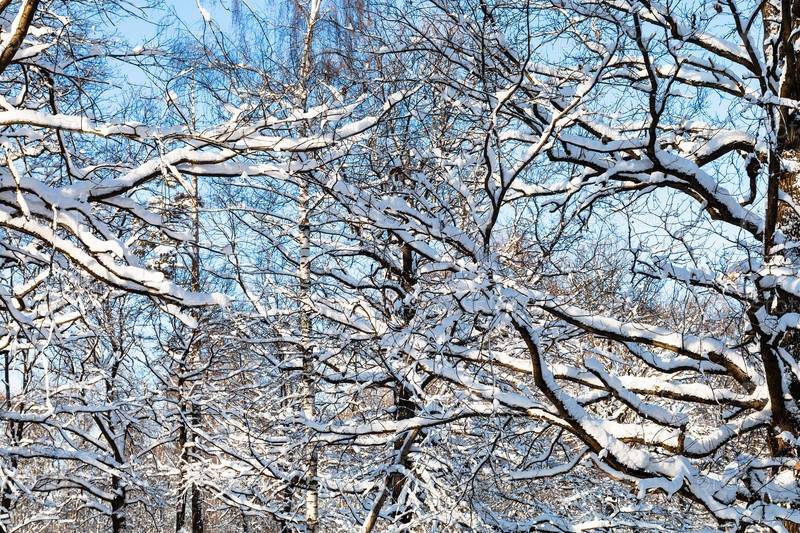 Заснеженные ветви в солнечный зимний день