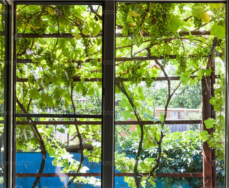 Вид на тенистый виноградник на террасе через окно