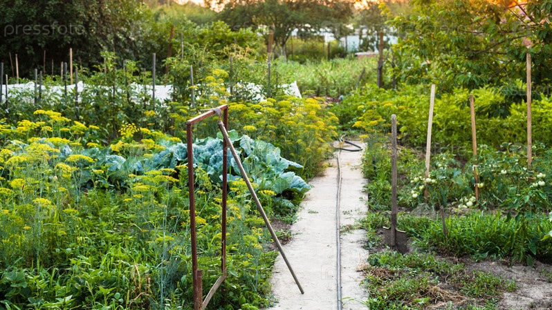 Вид на загородный сад при летнем закате