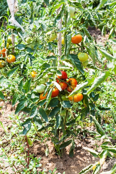 Куст с спелыми и незрелыми помидорами в саду