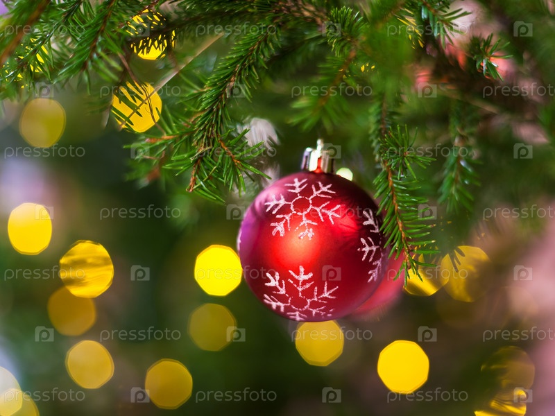 Один красный шар на рождественской елке ветвь в помещении