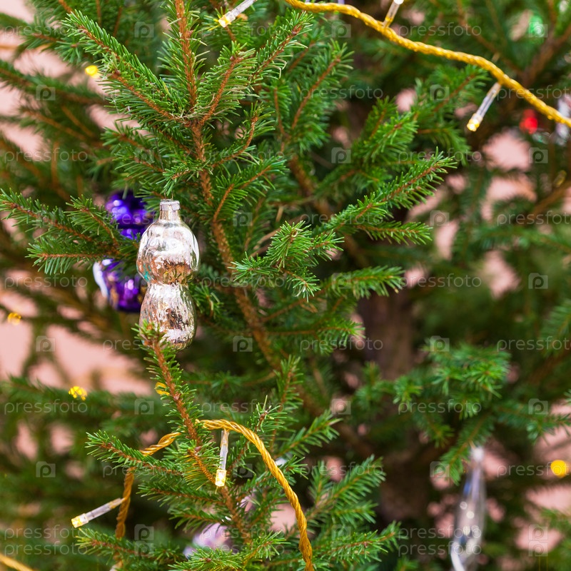 Стеклянная фигура и гирляндные огни на рождественской елке