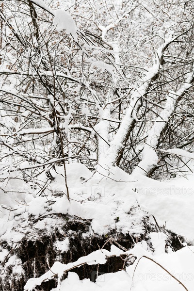 Сломанное покрытое снегом дерево в снежном лесу зимой