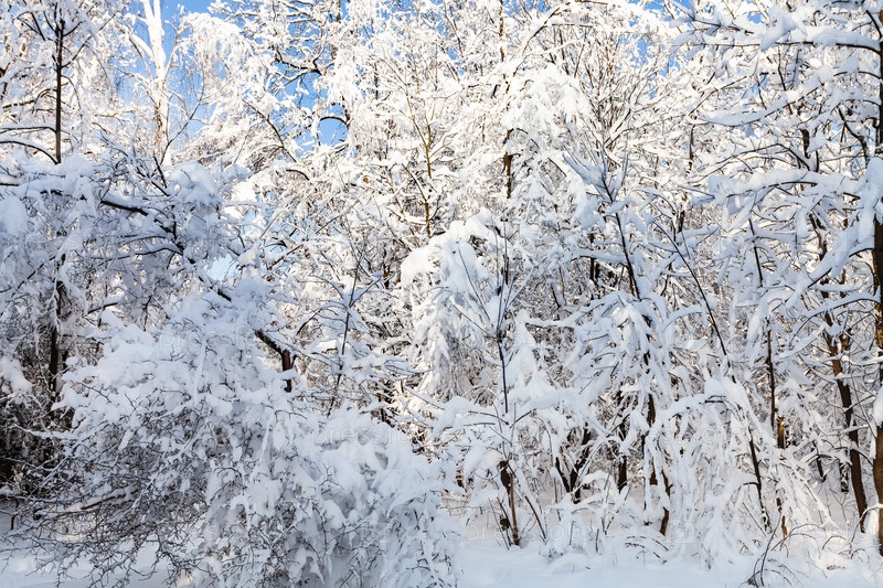 Снежные деревья и кустарники в лесном парке зимой