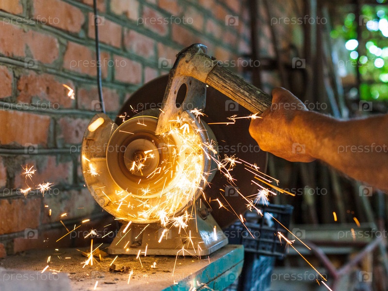 Фермер оттачивает удар на электрическом мельничном камне