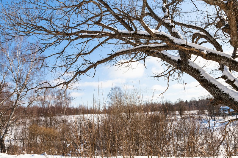 Снег покрывал ветви старой березы зимой