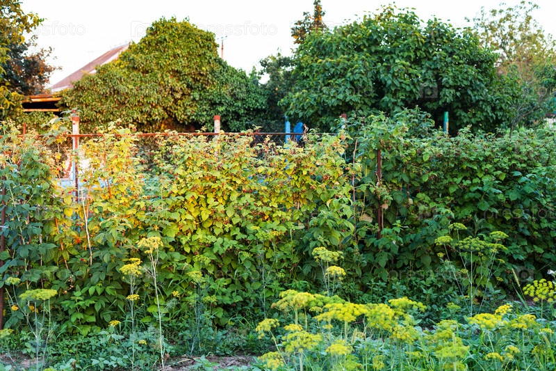 малиновый куст в загородном саду летом вечером