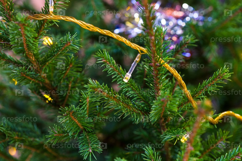 Гирландные огни на естественной рождественской елке в помещении