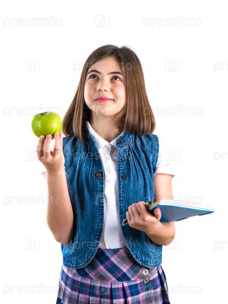 Школьница с блокнотом и яблоком на белом фоне