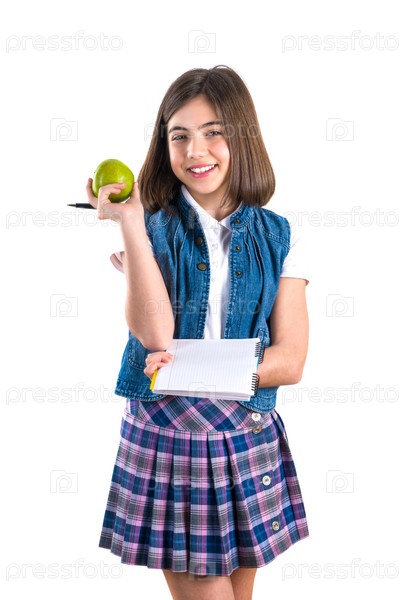 Школьница с блокнотом и яблоком на белом фоне