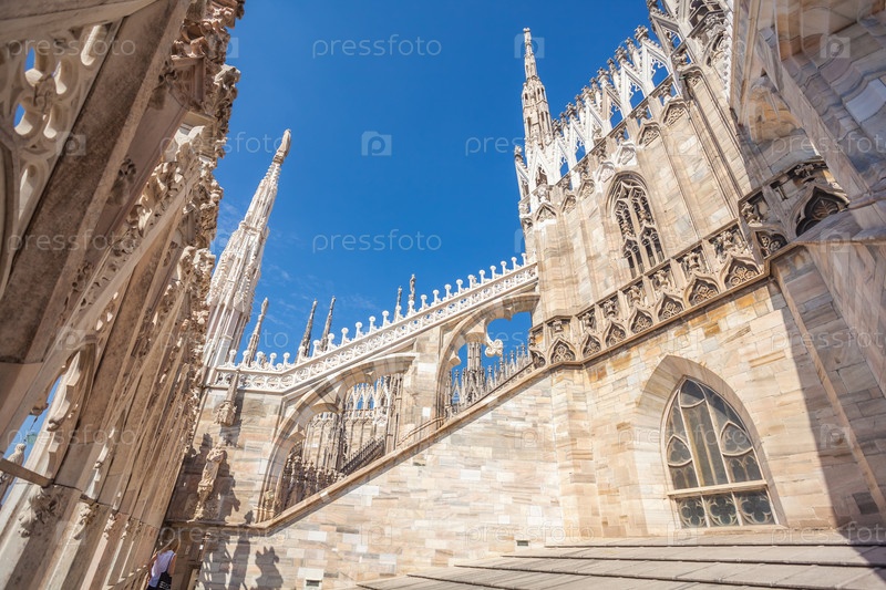 Вид на готическую архитектуру и искусство с крыши Миланского собора (Duomo di Milano), Италия