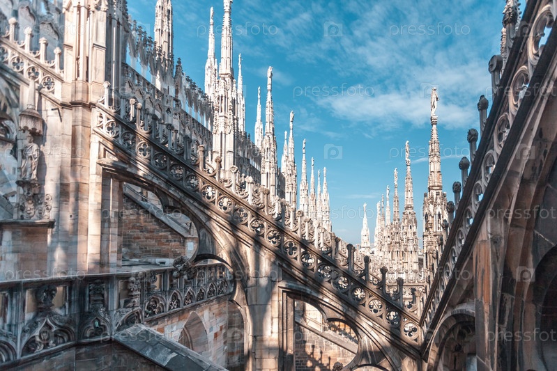 Вид на готическую архитектуру и искусство с крыши Миланского собора (Duomo di Milano), Италия