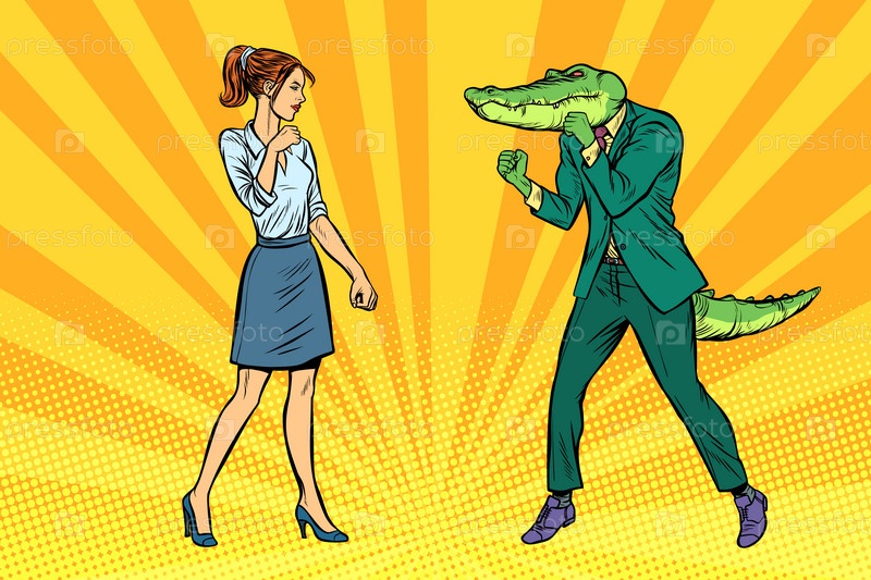 Женщина-бизнесмен Боксерская борьба с крокодилом рептилоидом