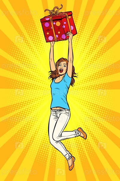 Веселая молодая женщина прыгает с подарком