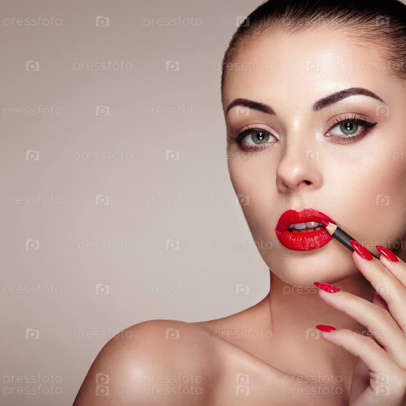 Красивая женщина рисует губы помадой