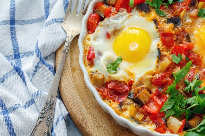 Пикантная шакшука с яйцами, баклажанами и помидорами