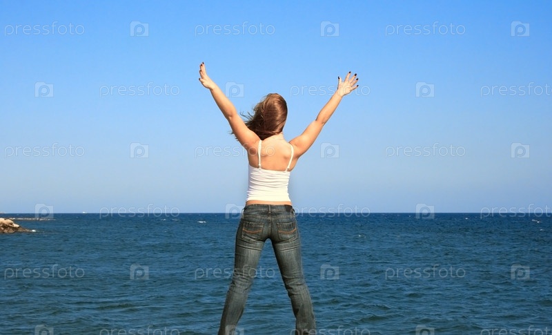 Молодая женщина с распростертыми вверх руками смотрит в морскую даль