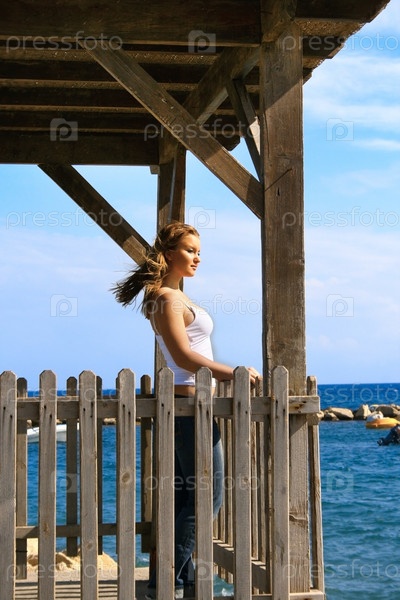 Молодая женщина под деревянным навесом смотрит в морскую даль
