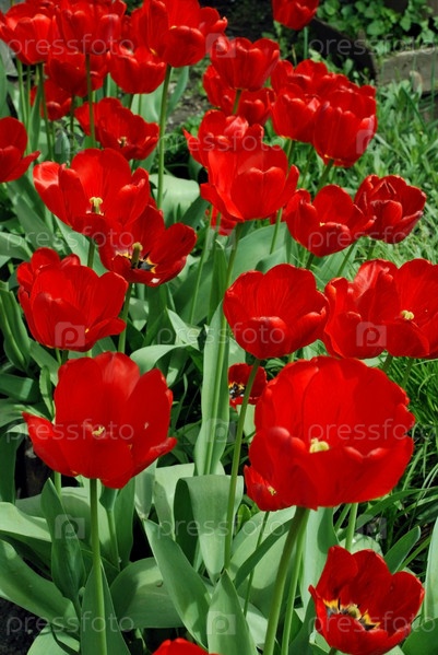 Прекрасный сад с красными тюльпанами