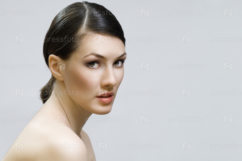 Портрет девушки брюнетки на сером фоне
