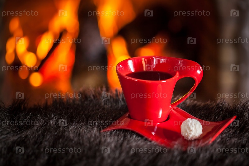 Красная чашка чая или кофе с шоколадом возле камина на деревянном столе.Зимняя и рождественская концепция праздника